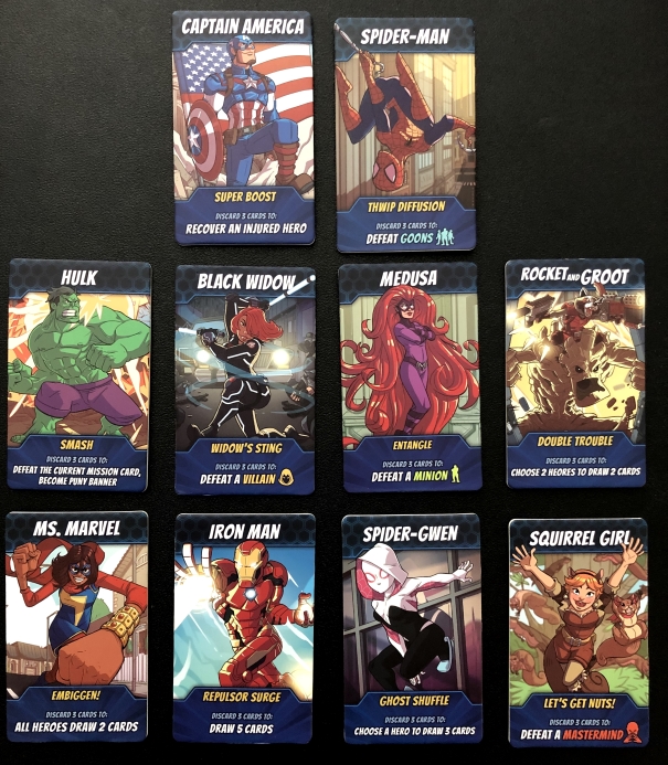 This game will be especially appealing for comic book fans in general and Marvel fans in particular. The play style of the game fits the hero theme well. And as you can see in our photos below, they did a great job with the artwork. There are also a wide variety of villians included from the Marvel universe. The particular heroes chosen made seem odd as some more obscure ones were included, but it can also be a fun way to learn about some new heroes.