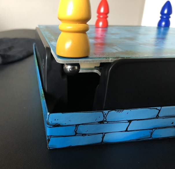 of the playing board. Beneath the playing board are wooden walls that will dislodge the ball if a player passes over the wall ("through an